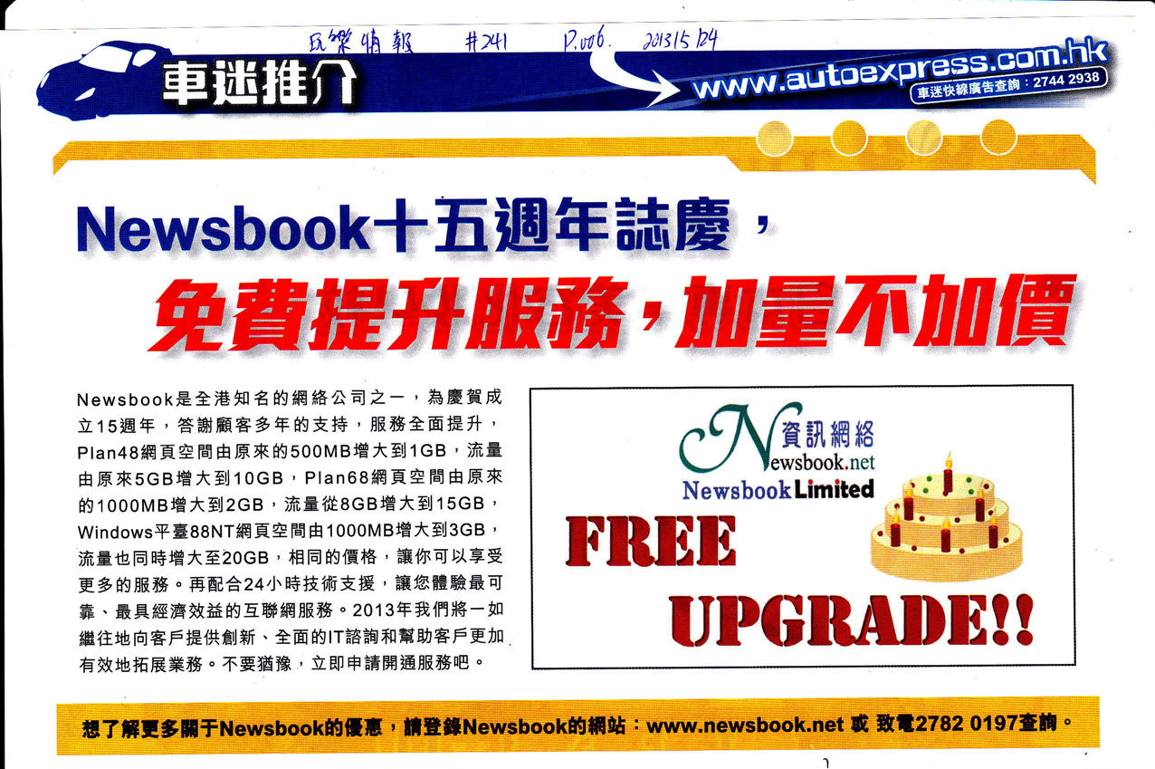 Newsbook是全港知名的網絡公司之一,為慶賀成立15週年,答謝顧客多年的支持,服務全面提升,Plan48網頁空間由原來的500MB增大到1GB,流量由原來5GB增大到10GB,Plan68網頁空間由原來的1000MB增大到2GB,流量從8GB增大到15GB, Windows平臺88NT網頁空間由1000MB增大到3GB,流量也同時增大至20GB,相同的價格,讓你可以享受更多的服務。再配合 24 小時技術支援,讓您體驗最可靠、最具經濟效益的互聯網服務。2013年我們將一如繼往地向客戶提供創新、全面的IT諮詢和幫助客戶更加有效地拓展業務。不要猶豫,立即申請開通服務吧。
